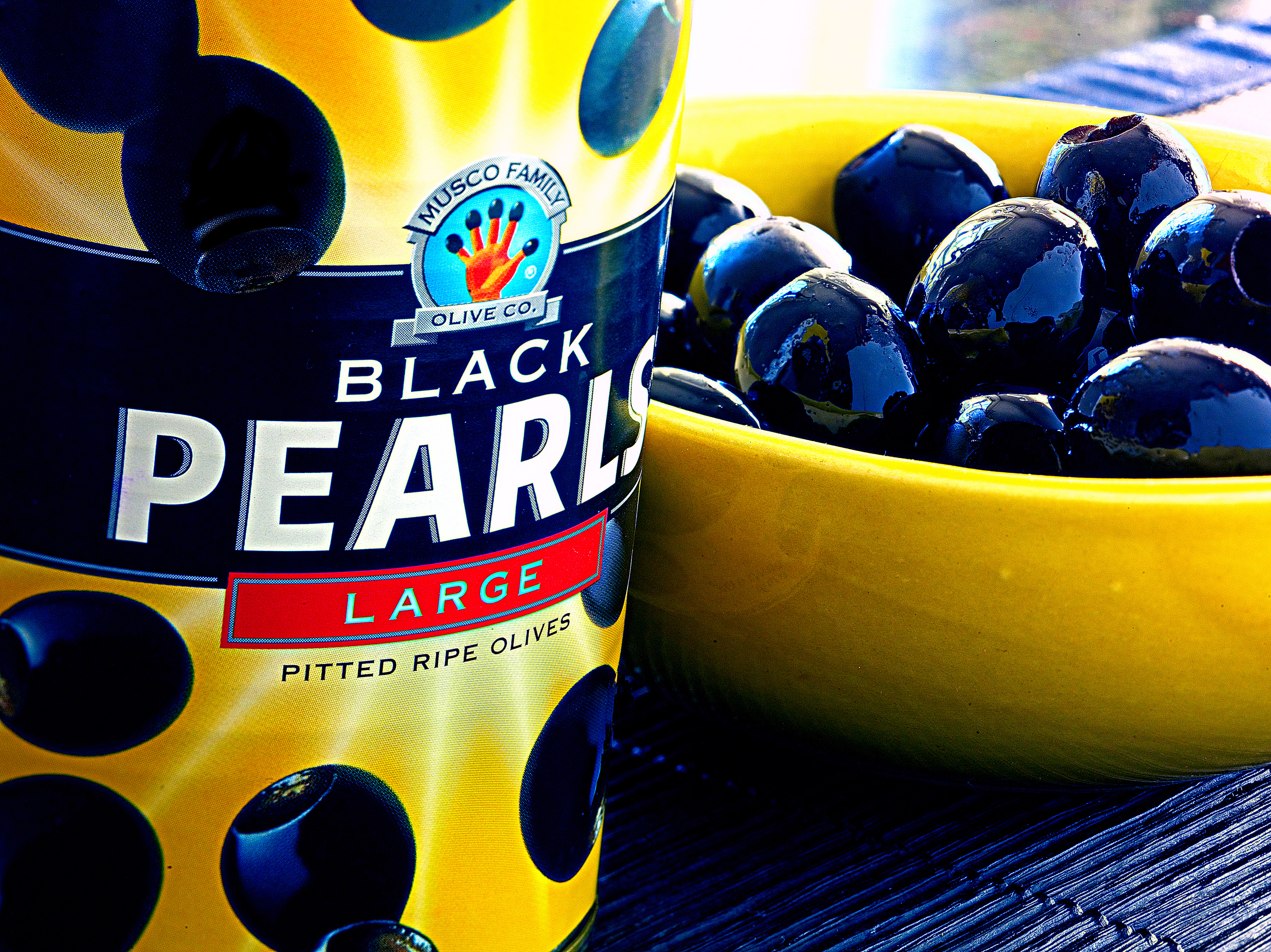 A study in color contrasts, here we see the magnificence of black and yellow with blue highlights in the olives.