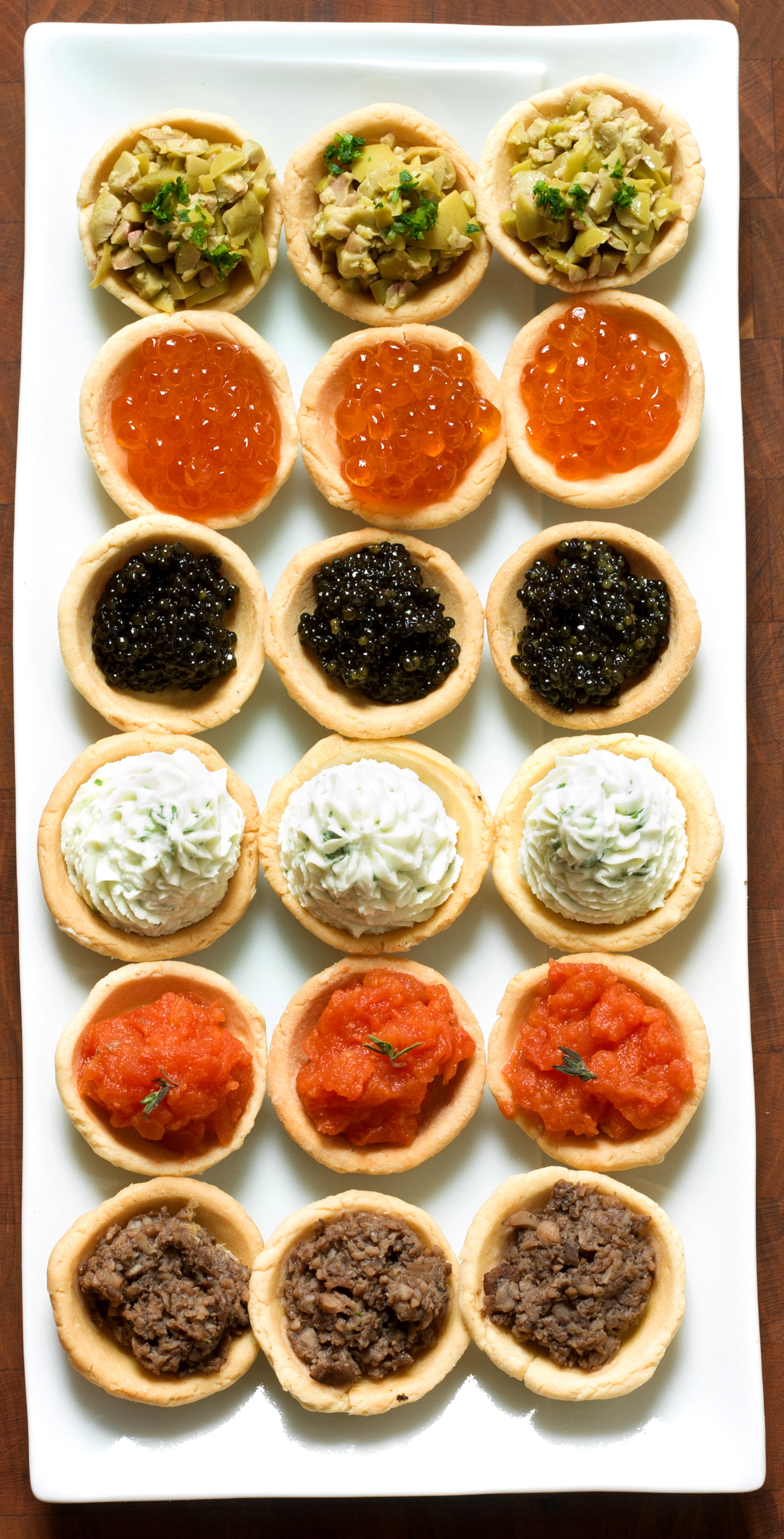 An assortment of miniature tartlets, each with its own flavorful filling. Olive tapanade, salmon roe, caviar, garlic-flavored potato puree, tomatoes, and chopped mushrooms are each used.